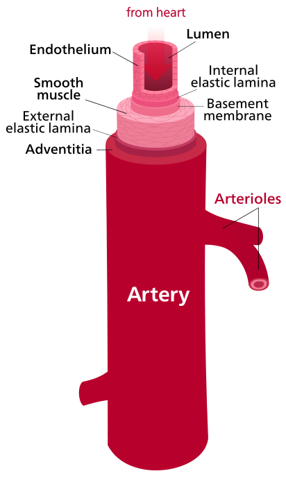 Did you know that blood vessels come fully equipped with the ability to help regulate blood pressure? This is possible because of smooth muscle cells that wrap around blood vessels (see image above). Because they wrap around the inner layers of the blood vessel, when these cells contract, the lumen od the blood vessel becomes narrow and increases blood pressure. When they relax, the blood vessels widen thereby lowering blood pressure. It is important that this system functions properly because failure can lead to uncontrolled high (or low) blood pressure and can damage blood vessels.
